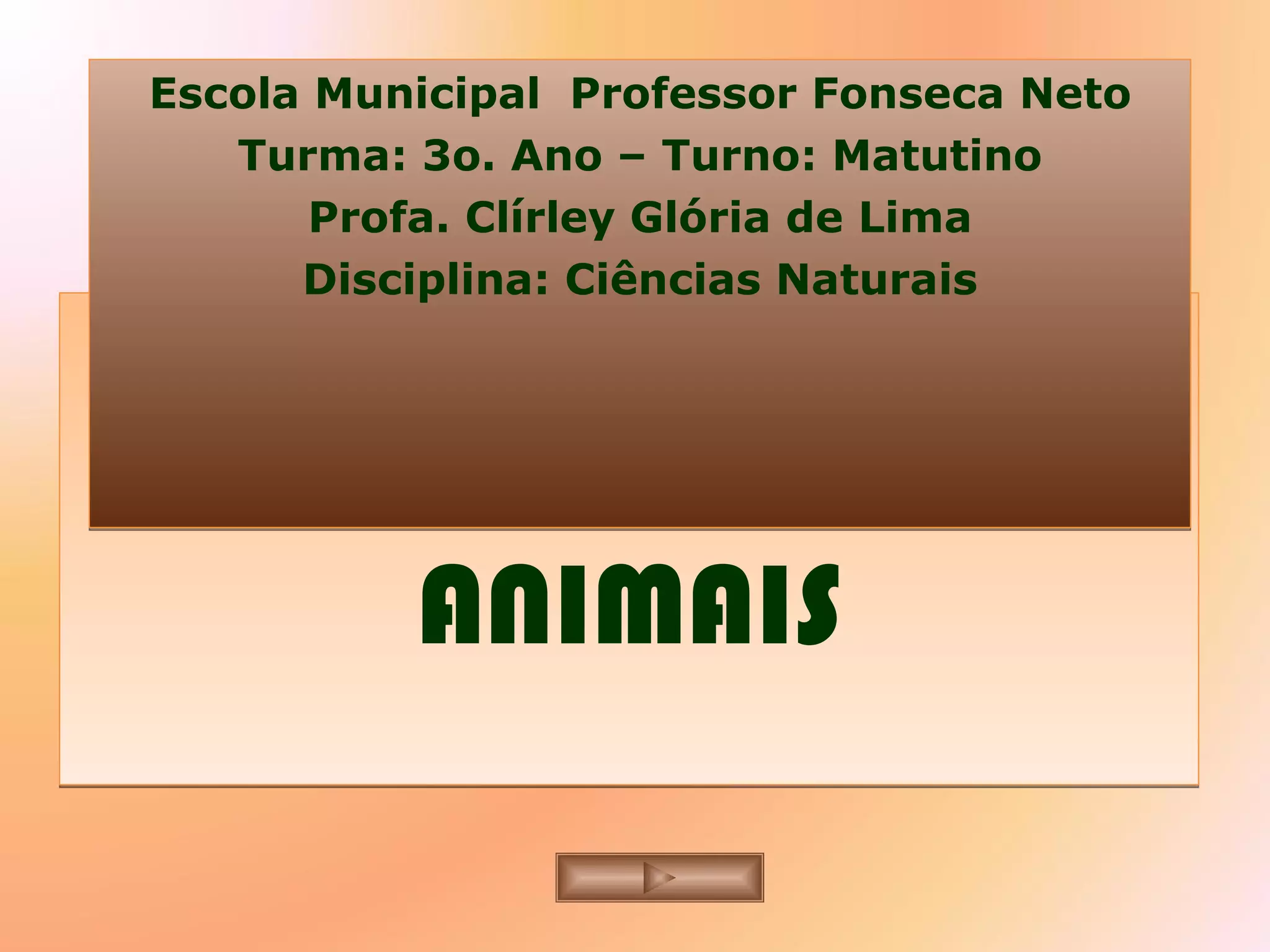 O documento classifica os cinco grupos de animais (mamíferos, aves, répteis, anfíbios e peixes) e descreve suas principais características, como o desenvolvimento dos filhotes e a cobertura da pele. A aula inclui assistir a um filme sobre vida selvagem.