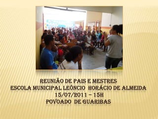O documento resume duas reuniões realizadas na Escola Municipal Leôncio Horácio de Almeida. A primeira reunião com pais e responsáveis discutiu a importância da integração entre escola e família, frequência escolar, reforço escolar e incentivo à leitura. A segunda reunião com funcionários avaliou a relação entre escola e comunidade e elaborou propostas para aprimorá-la, com foco em vincular o currículo aos estudantes e incluir aulas práticas.