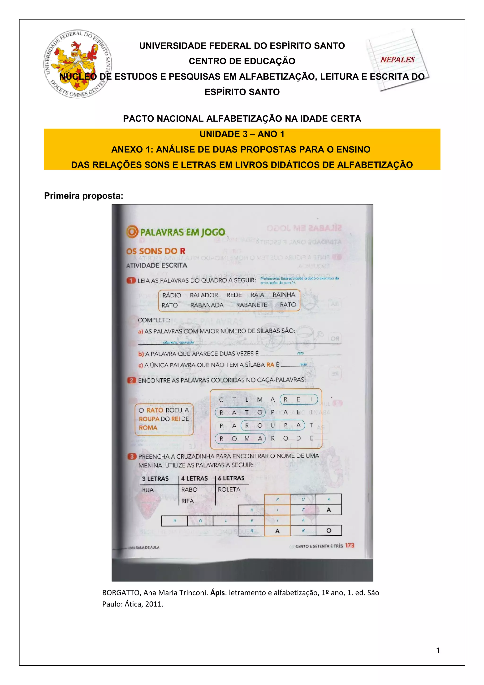 Este documento analisa duas propostas para o ensino das relações entre sons e letras em livros didáticos de alfabetização. A primeira proposta vem do livro "Ápis" e a segunda de "Projeto Descobrir". O documento instrui os leitores a analisarem o uso da letra R nessas propostas e quais abordagens de aprendizagem cada uma adota.