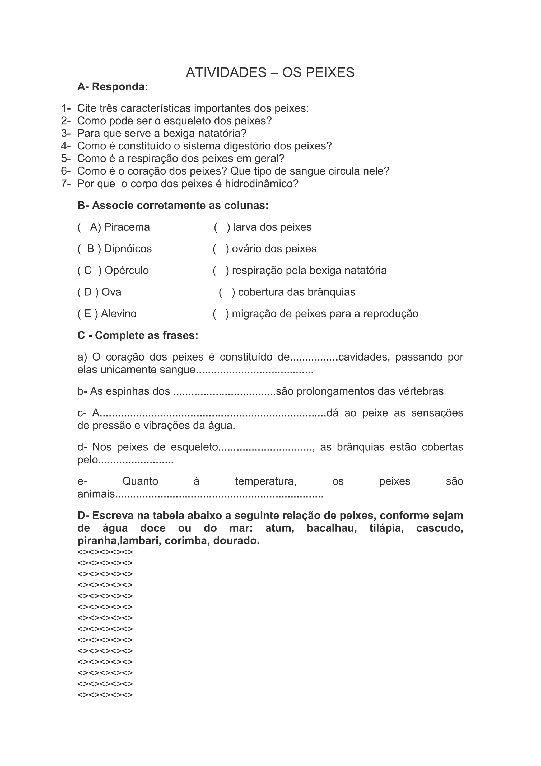 O documento fornece informações sobre as características de peixes e anfíbios. Aborda tópicos como esqueleto, sistema respiratório, circulatório e digestivo de peixes, além de reprodução, classificação e adaptações de peixes e anfíbios. Há também questões sobre associação de colunas e completar frases relacionadas a esses temas.
