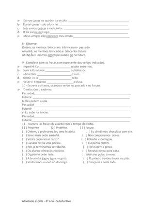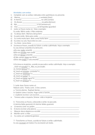 O documento fornece instruções para atividades envolvendo verbos no presente, passado e futuro. As atividades incluem completar frases com verbos indicados, juntar frases usando verbos no presente, escrever frases usando verbos no futuro e passado, e numerar frases de acordo com o tempo verbal usado.