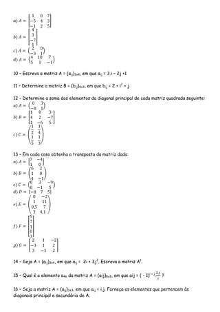 2. São solicitados cálculos e determinações de elementos, matrizes resultantes de operações, resolução de equações matriciais e verificação de propriedades de matrizes dadas.
