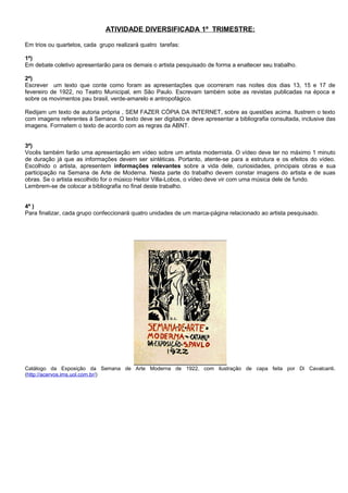 O documento descreve uma atividade escolar sobre a Semana de Arte Moderna de 1922 no Brasil. Os alunos serão divididos em grupos para pesquisar artistas modernistas, produzir textos, vídeos e marcadores sobre suas vidas e obras. Fontes online são fornecidas para apoiar a pesquisa.