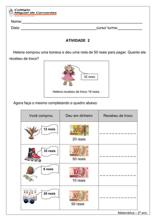O documento contém 7 atividades de revisão de matemática para alunos do 2o ano. As atividades envolvem troca de dinheiro e identificação de valores monetários, dias da semana e datas em um calendário.