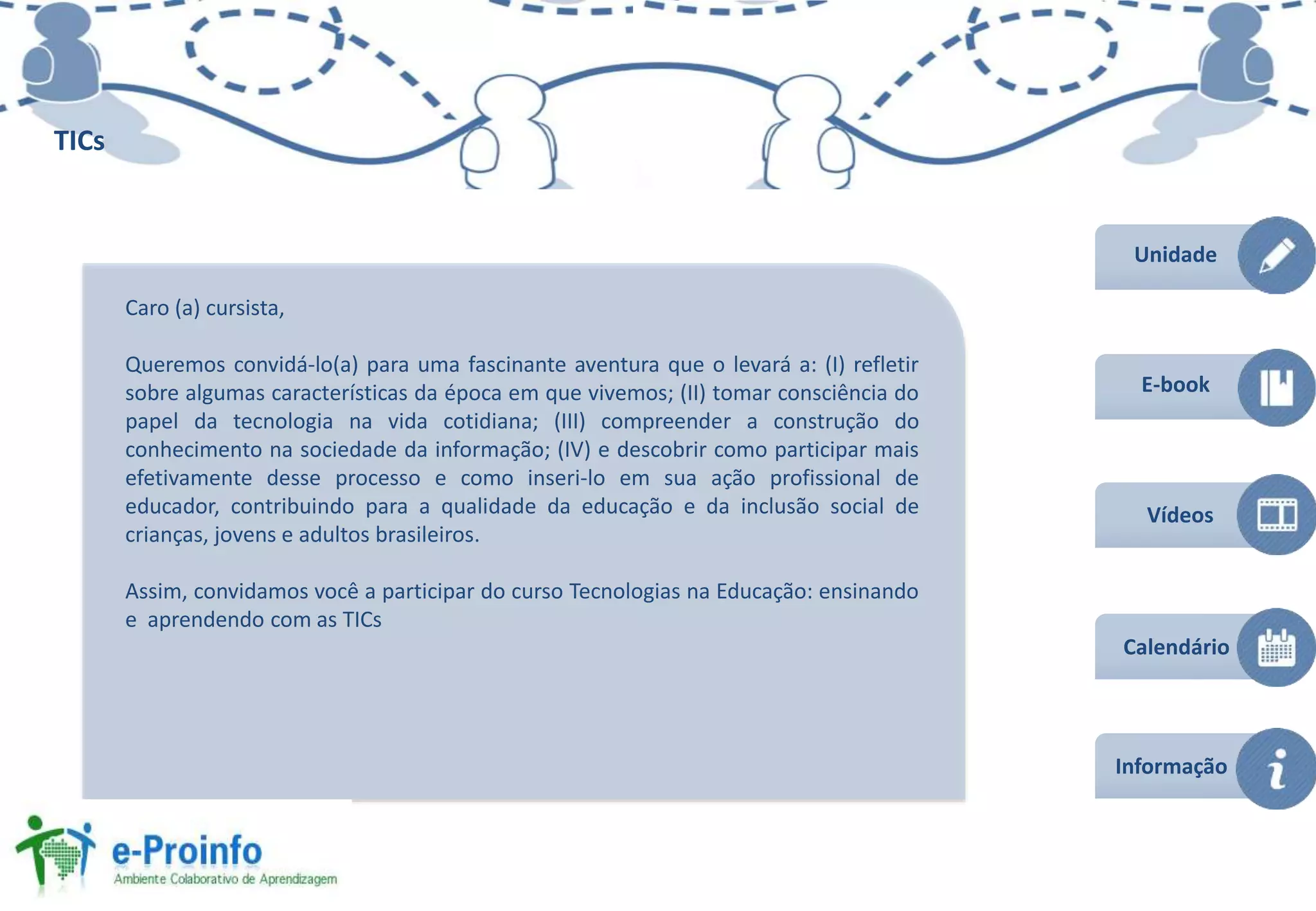 Este documento convida cursistas a participar de um curso sobre tecnologias na educação, apresentando (I) reflexões sobre a época atual e o papel da tecnologia, (II) compreensão da construção do conhecimento na sociedade da informação, e (III) como participar efetivamente desse processo. O curso é composto por 4 unidades com atividades como produção de textos, pesquisas, discussões e projetos integrados sobre o tema.
