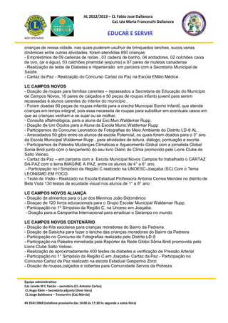 Este documento resume as atividades realizadas pelos vários Lions Clubes da região em novembro de 2012. As atividades incluíram: realização de testes de visão, doação de alimentos e roupas para famílias carentes, participação em eventos comunitários, realização do concurso Cartaz da Paz em escolas e doação de equipamentos médicos.
