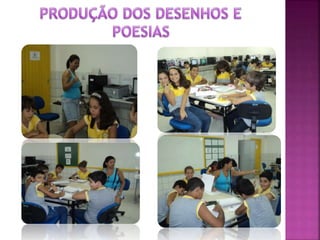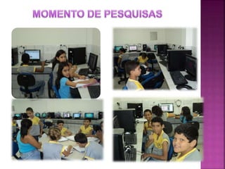 O documento descreve um vídeo feito por um aluno durante um recreio interdisciplinar na Escola Estadual Presidente Kennedy. Também descreve atividades desenvolvidas por alunos do 5o ano da Escola Estadual Berilo Wanderley para o Dia das Mães, incluindo desenhos e poesias feitos com base em pesquisas na Internet.