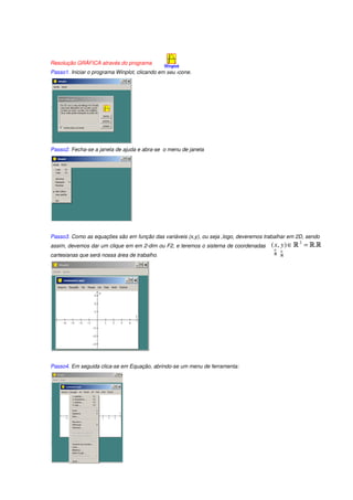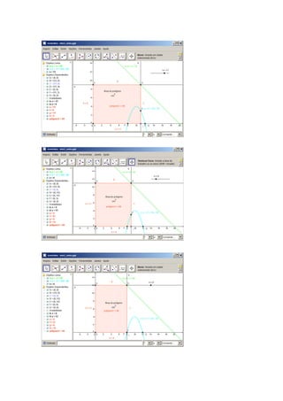 O documento apresenta atividades sobre o uso de programas livres para o ensino de matemática e tecnologia. A primeira atividade aborda a resolução algébrica de sistemas de equações e a resolução gráfica através do programa Winplot. A segunda atividade trata da construção de um retângulo com área máxima de 96cm2 usando um barbante de 40cm e resolução algébrica e gráfica. A terceira atividade demonstra o teorema de Pitágoras usando a construção de um quadrado no programa C