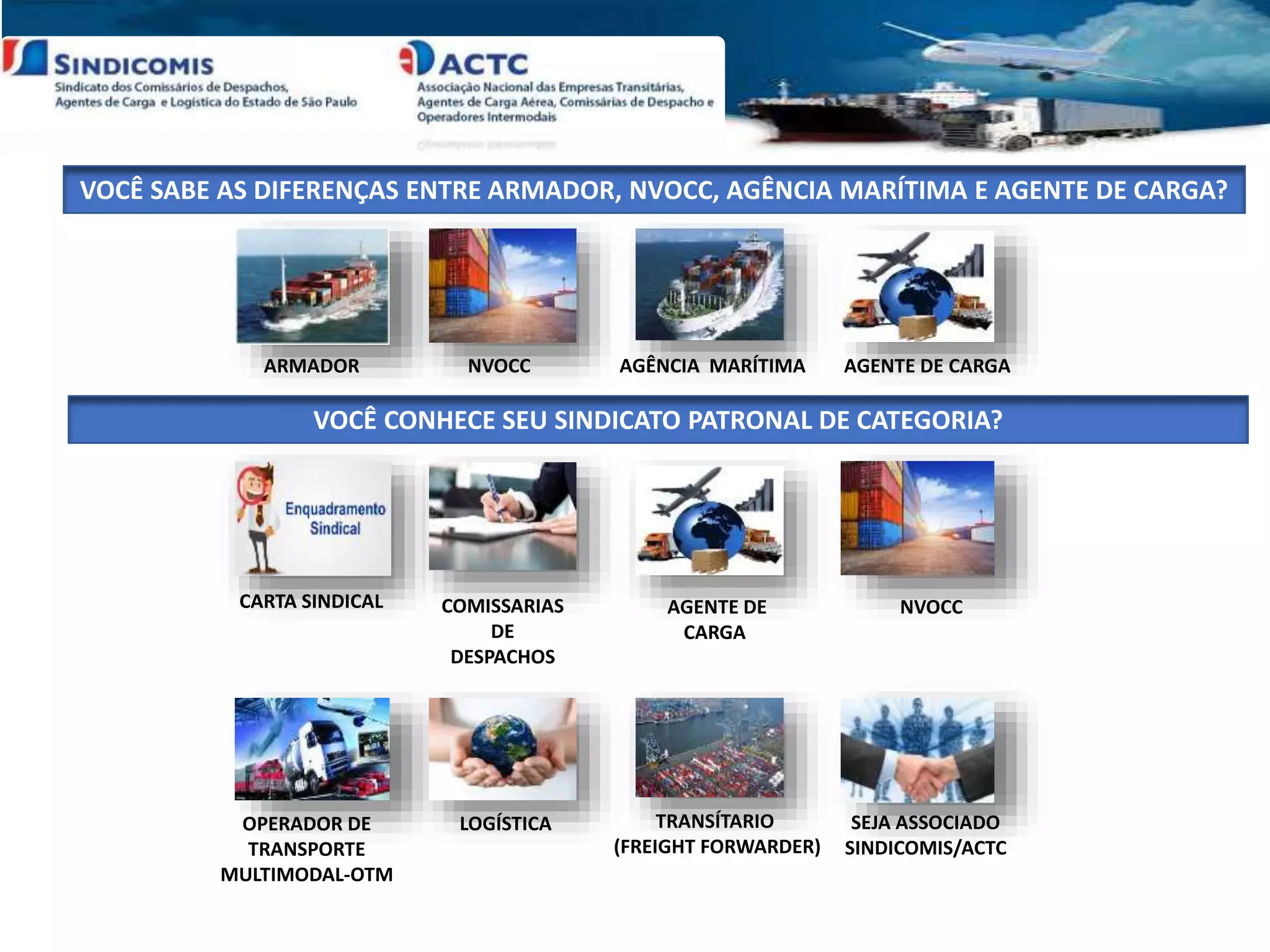 O documento descreve as diferenças entre vários tipos de agentes e operadores de transporte marítimo e logística, incluindo armadores, NVOCCs, agências marítimas, agentes de carga e OTMs. Explica que armadores operam navios, NVOCCs organizam transporte sem navios próprios, agências marítimas representam armadores, agentes de carga consolidam cargas e OTMs planejam transporte multimodal. O documento também fornece detalhes sobre os sindicatos patronais que representam essas categorias profissionais.