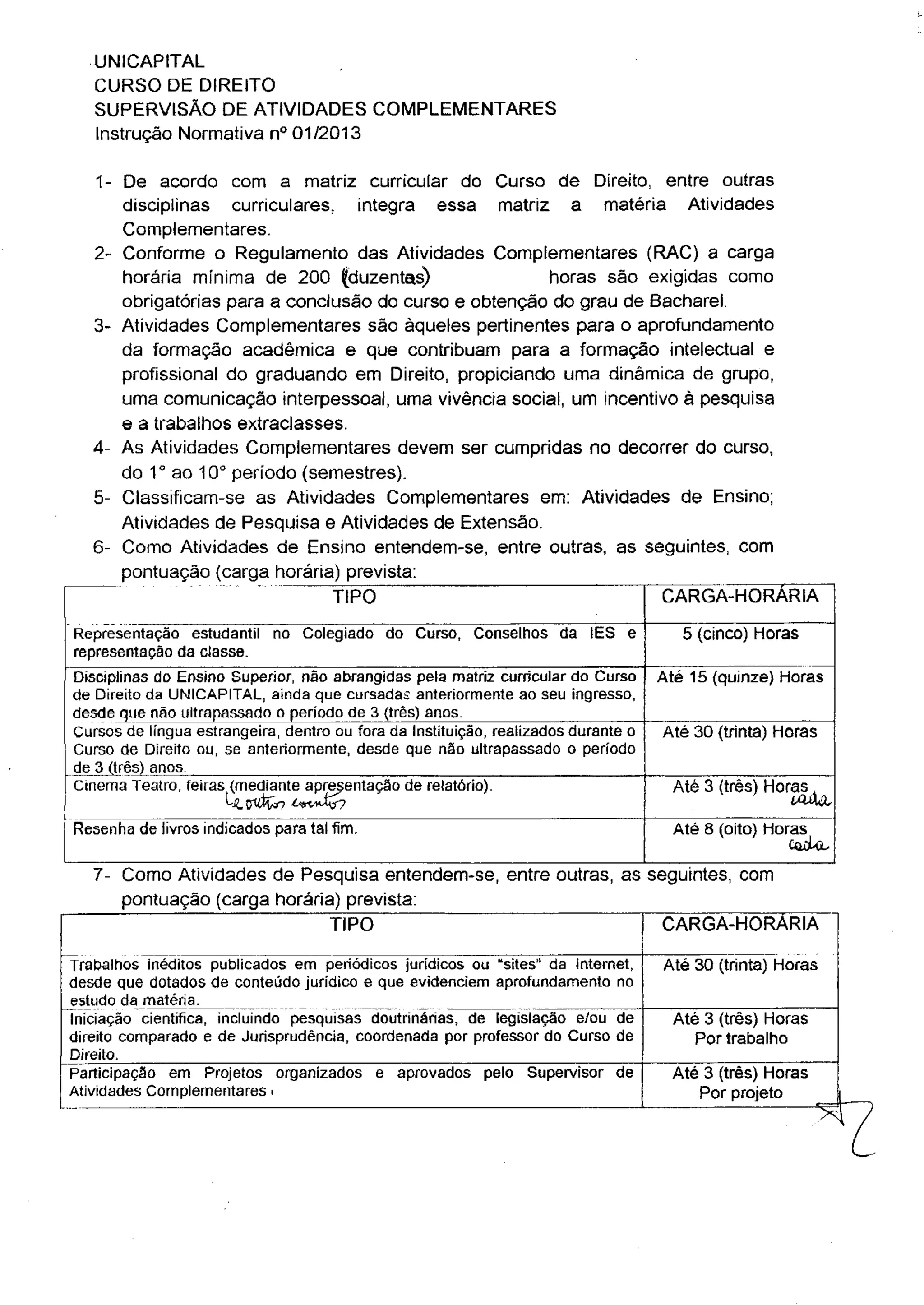 Este documento descreve as diretrizes para as Atividades Complementares no Curso de Direito da UNICAPITAL, incluindo que é obrigatório completar 200 horas dessas atividades, divididas em Ensino, Pesquisa e Extensão, e que os alunos devem apresentar documentação comprobatória para receber pontuação.