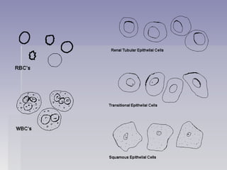 O documento descreve os principais tipos de células e elementos encontrados em exames de urina, incluindo hemácias, leucócitos, células epiteliais e neoplásicas. Ele também detalha os diferentes tipos de cilindros (hialinos, hemáticos, leucocitários etc), seus significados clínicos e características morfológicas. Por fim, discute os cristais normais e anormais que podem se formar na urina e o que suas presenças podem indicar.