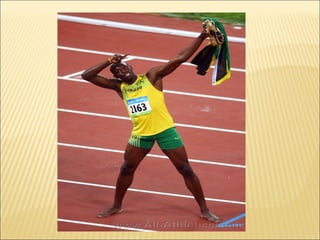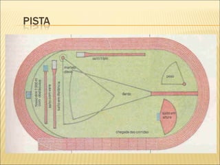 O documento descreve o esporte do atletismo, incluindo suas origens nas Olimpíadas da Grécia Antiga, as principais modalidades como corridas, saltos e arremessos, e detalhes sobre competições e organização do esporte.