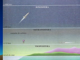 O documento descreve as camadas da atmosfera terrestre, os principais gases que as compõem e os poluentes que afetam cada camada. Também discute os efeitos da poluição atmosférica, como o efeito estufa e o buraco na camada de ozônio, além das ações para reduzir a emissão de poluentes.