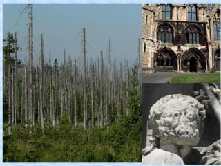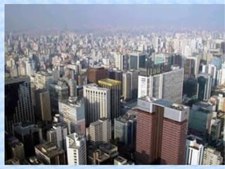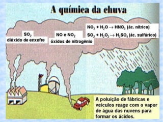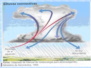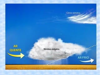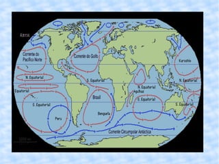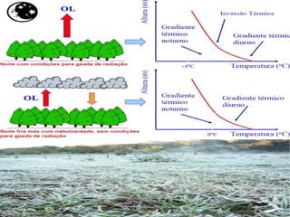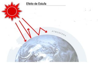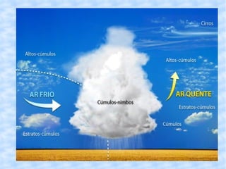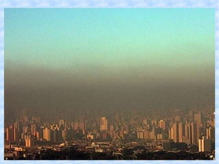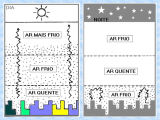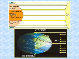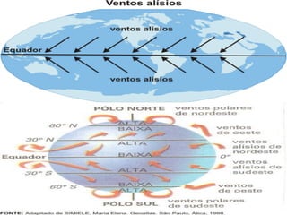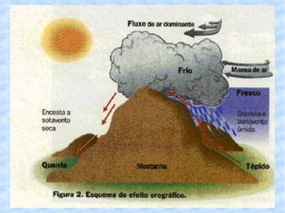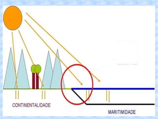 O documento descreve os principais fatores climáticos que influenciam o clima e a atmosfera da Terra, incluindo latitude, altitude, maritimidade, correntes marítimas, massas de ar, frentes, ventos, precipitação e camadas atmosféricas. Além disso, aborda fenômenos como efeito estufa, ilha de calor, inversão térmica e chuva ácida.