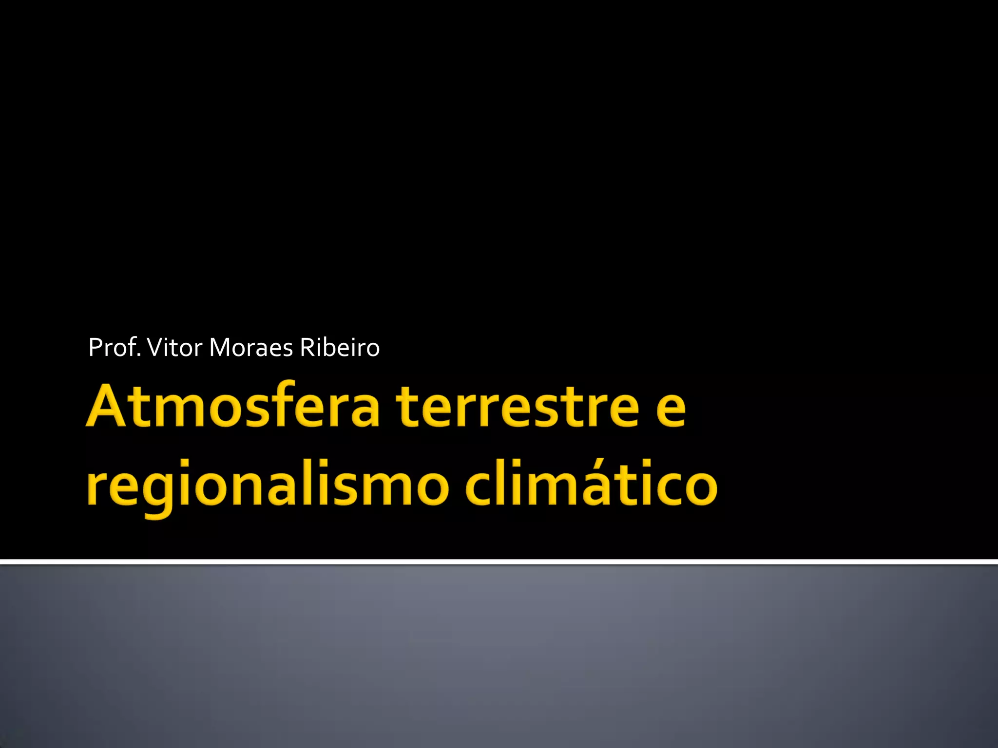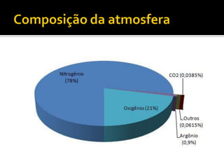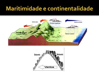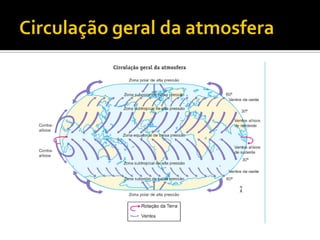 O documento descreve as camadas da atmosfera, incluindo a camada limite, troposfera, estratosfera, mesosfera, ionosfera, exosfera e magnetosfera, detalhando suas características e temperaturas. Também discute a diferença entre clima e tempo, fatores que influenciam o clima, e as zonas climáticas, destacando a classificação de Köppen com suas massas de ar. Exemplos de climas, como equatorial, tropical, desértico e temperado são apresentados, com suas definições e características típicas.