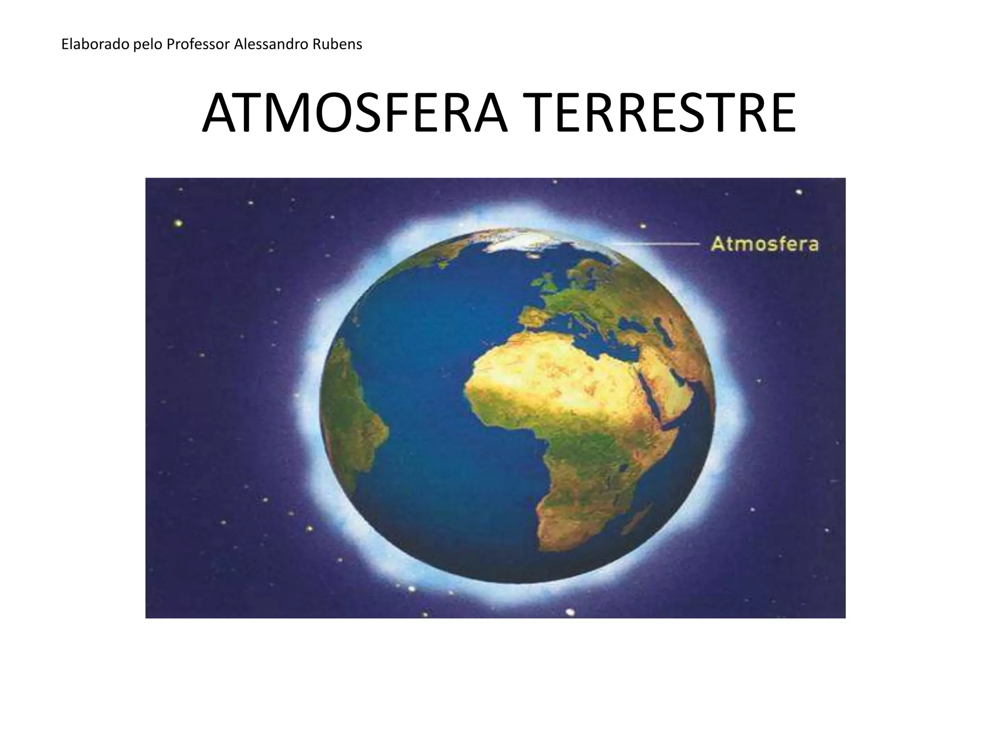 O documento descreve a atmosfera terrestre, incluindo sua composição e camadas. A atmosfera é composta principalmente por nitrogênio, oxigênio, argônio e vapor d'água, e contém gases que criam o efeito estufa, mantendo a temperatura da Terra habitável. A atmosfera é dividida em cinco camadas - exosfera, termosfera, mesosfera, estratosfera e troposfera - cada uma com características de temperatura e composição gasosa únicas.