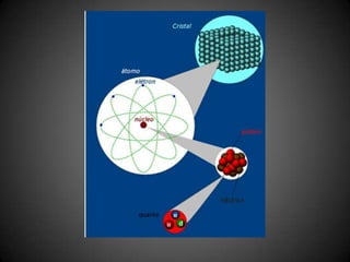 Este documento descreve a estrutura do átomo, incluindo o núcleo com prótons e nêutrons, a zona periférica com elétrons orbitando em volta do núcleo, e que os átomos ocupam espaço devido aos elétrons. Também explica que o diâmetro dos átomos é de aproximadamente 0,000000001 m e que o núcleo é cerca de 10.000 vezes menor que o átomo.