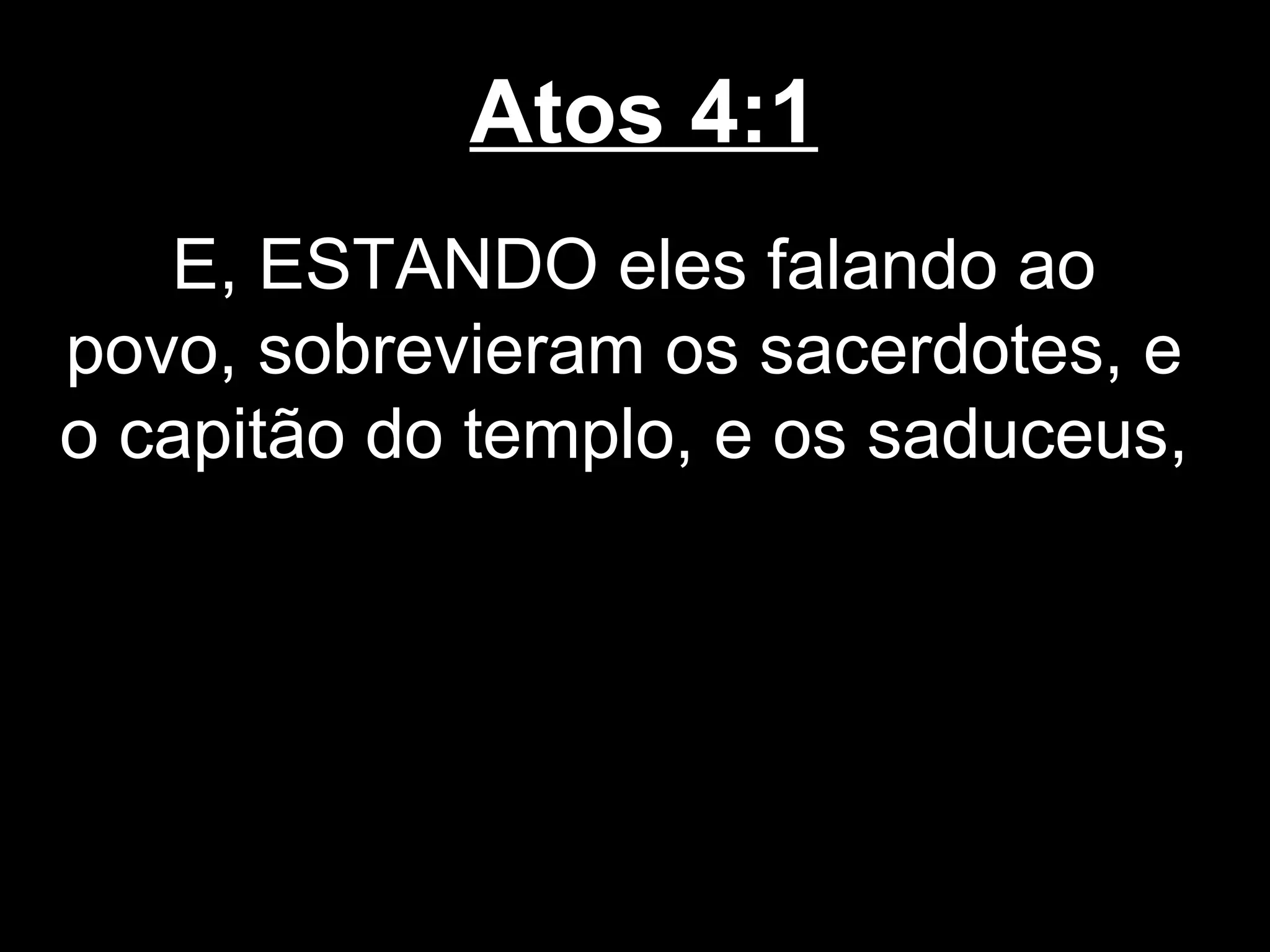 Os sacerdotes e saduceus ficaram irritados com Pedro e João por pregarem sobre a ressurreição de Jesus. Eles foram presos, mas muitas pessoas acreditaram neles. No dia seguinte, os líderes religiosos questionaram Pedro e João, mas não puderam negar o milagre feito em nome de Jesus. Eles foram ameaçados a não pregarem mais sobre Jesus.