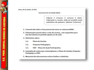 Este documento discute a importância da participação da comunidade escolar no planejamento e gestão da escola. Ele fornece diretrizes para a elaboração do Plano de Gestão, Proposta Pedagógica e PAP, enfatizando a democratização das informações e envolvimento de pais, alunos e professores por meio de canais de comunicação e reuniões.