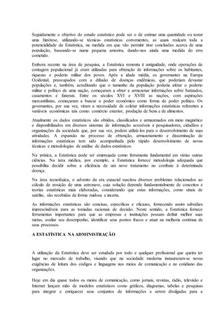 O documento discute a importância da estatística na administração de empresas, cobrindo tópicos como coleta e análise de dados para tomada de decisões, uso de indicadores para comparar desempenho ao longo do tempo, e aplicação de controle estatístico de processo para melhorar a qualidade de produtos. Ele fornece um exemplo de uma empresa que usa amostras para inspecionar lotes de produção e garantir que eles estejam dentro dos padrões de qualidade.