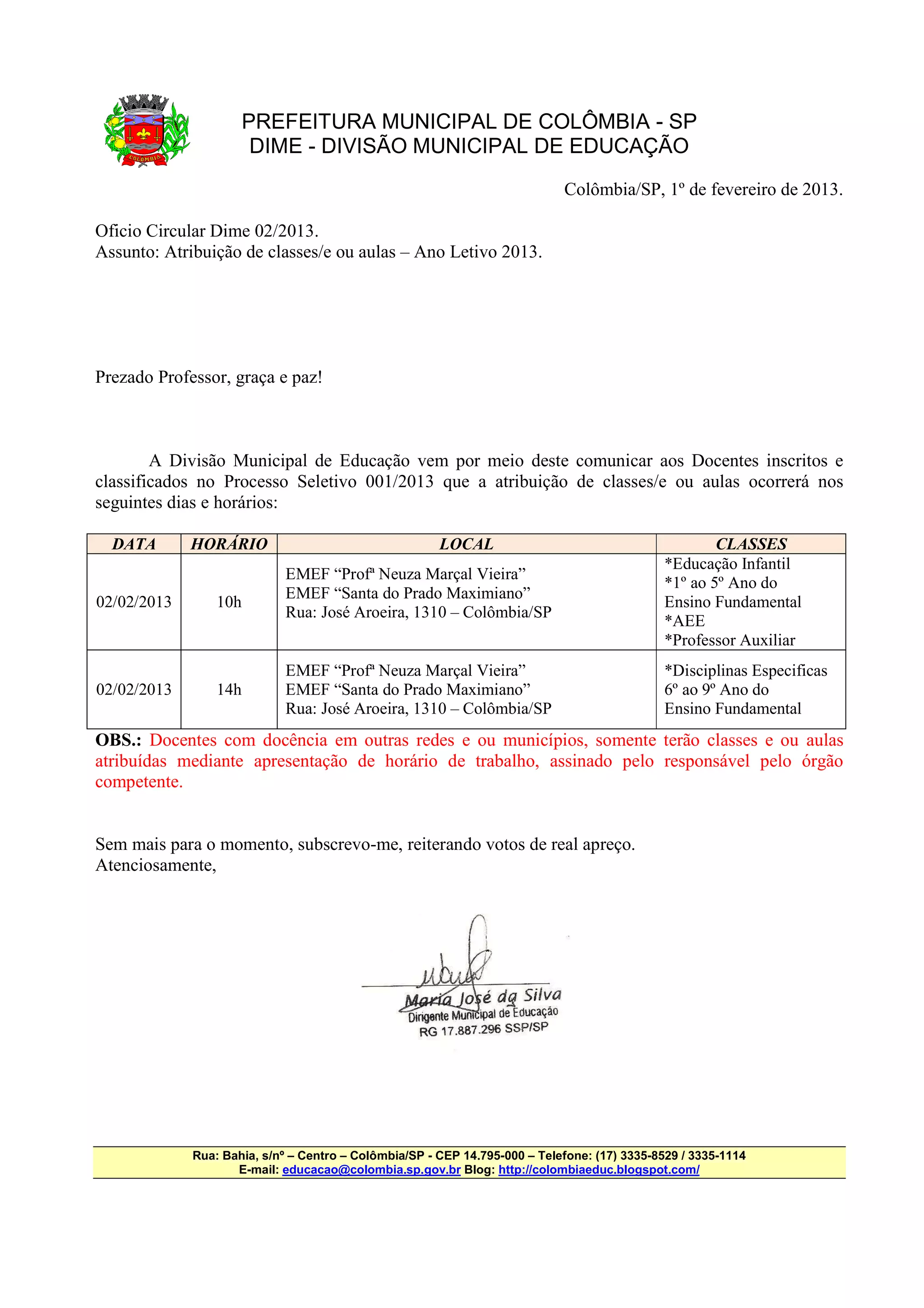 A Divisão Municipal de Educação de Colômbia-SP comunica aos professores a atribuição de classes e aulas nos dias 2 de fevereiro às 10h e 14h nas escolas EMEF "Profa Neuza Marçal Vieira" e EMEF "Santa do Prado Maximiano". Os professores devem apresentar horários de trabalho em outras redes.