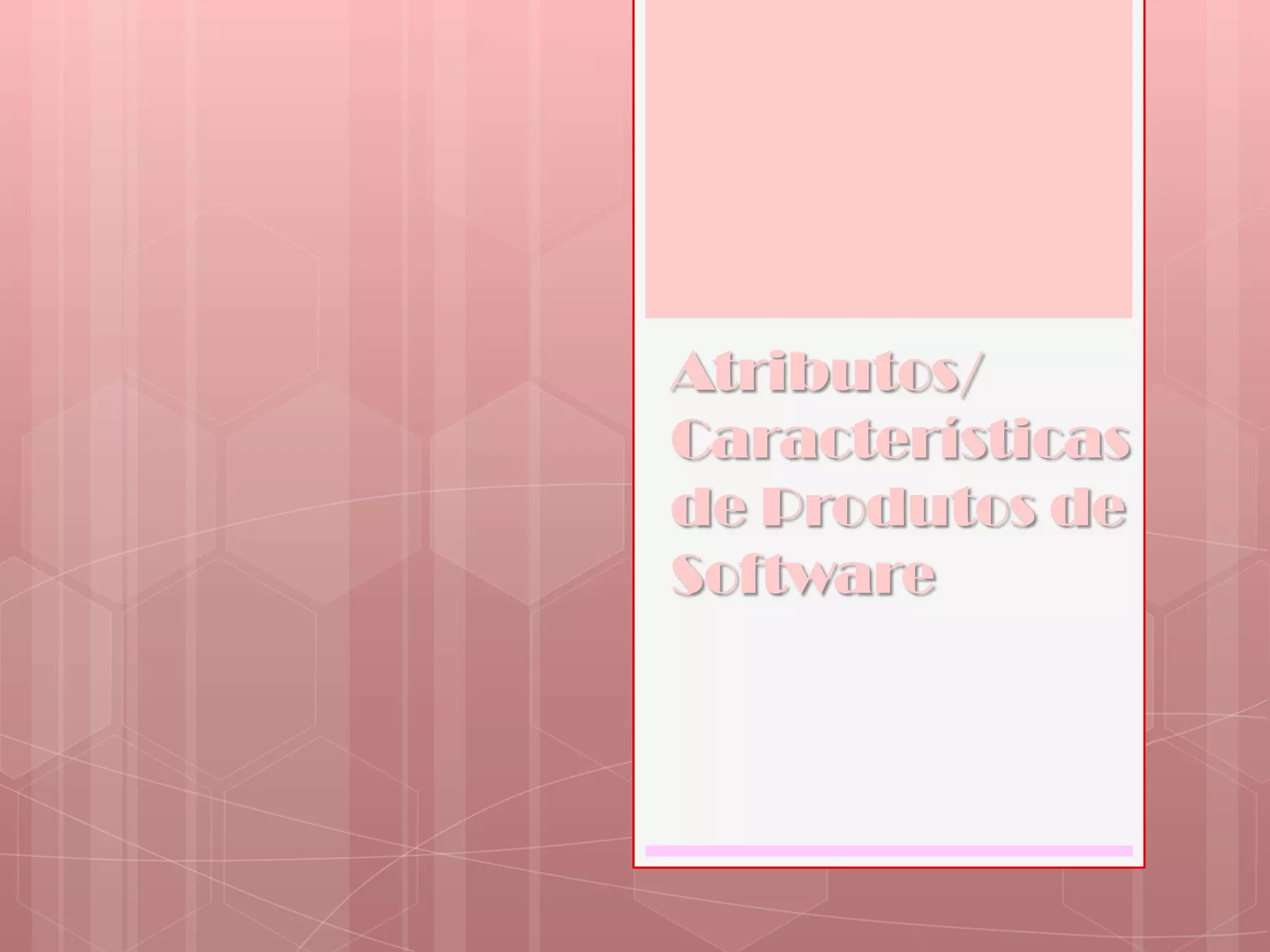 O documento descreve os atributos e características de produtos e processos de software. Detalha propriedades como facilidade de manutenção, confiança e eficiência para produtos, e produtividade, controlo e visibilidade para processos. Também discute princípios como modularidade, abstração e antecipação de alterações para melhorar qualidade e produtividade.