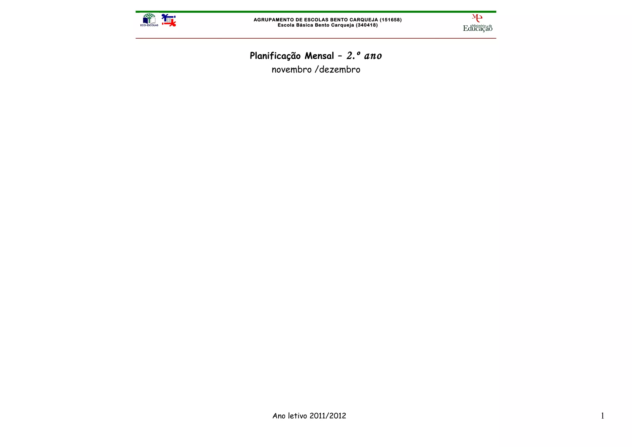 Este documento apresenta a planificação mensal para o 2o ano do Agrupamento de Escolas Bento Carqueja, incluindo os conteúdos programáticos e as competências específicas a desenvolver em cada área curricular no período de novembro a dezembro de 2011. As áreas abordadas incluem Estudo do Meio, Português, Matemática, Expressão Plástica e Corporal, Educação Musical, e Áreas Curriculares não Disciplinares.