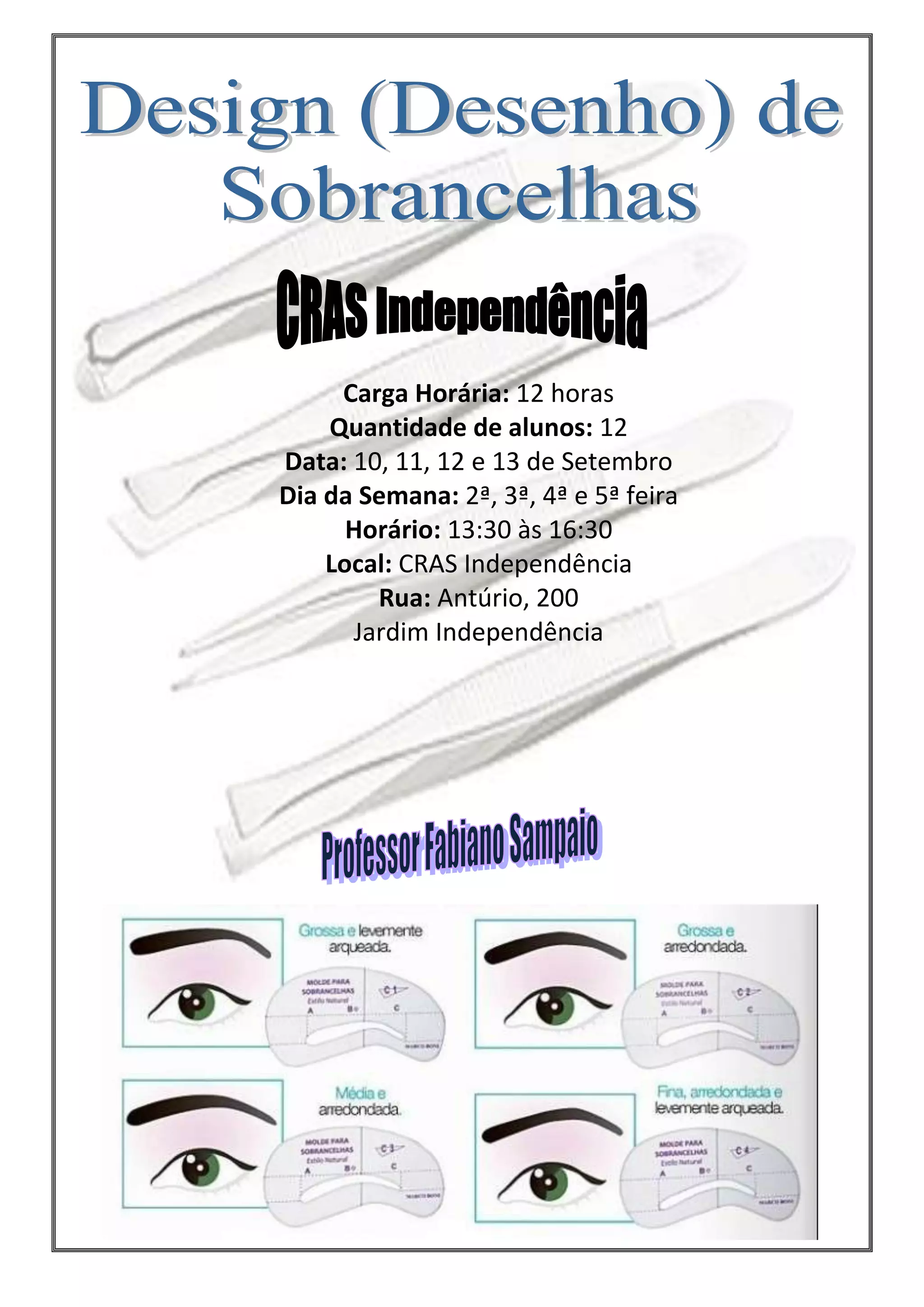 O curso ocorrerá de 10 a 13 de setembro, de segunda a quinta-feira, das 13:30 às 16:30 no CRAS Independência localizado na Rua Antúrio 200, com 12 horas de carga horária para 12 alunos.