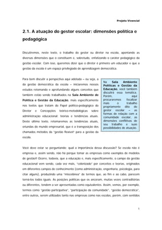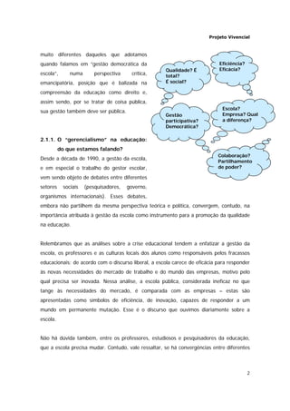 O documento discute a atuação do gestor escolar e as diferentes abordagens para a gestão da escola. A perspectiva defendida é a da gestão democrática, que vê o diretor como um educador e a escola como um espaço de aprendizagem democrática. Porém, nos últimos anos tem se difundido a visão "gerencialista" de gestão, que aplica conceitos e métodos das empresas na escola, priorizando resultados e eficiência em detrimento dos processos educativos.