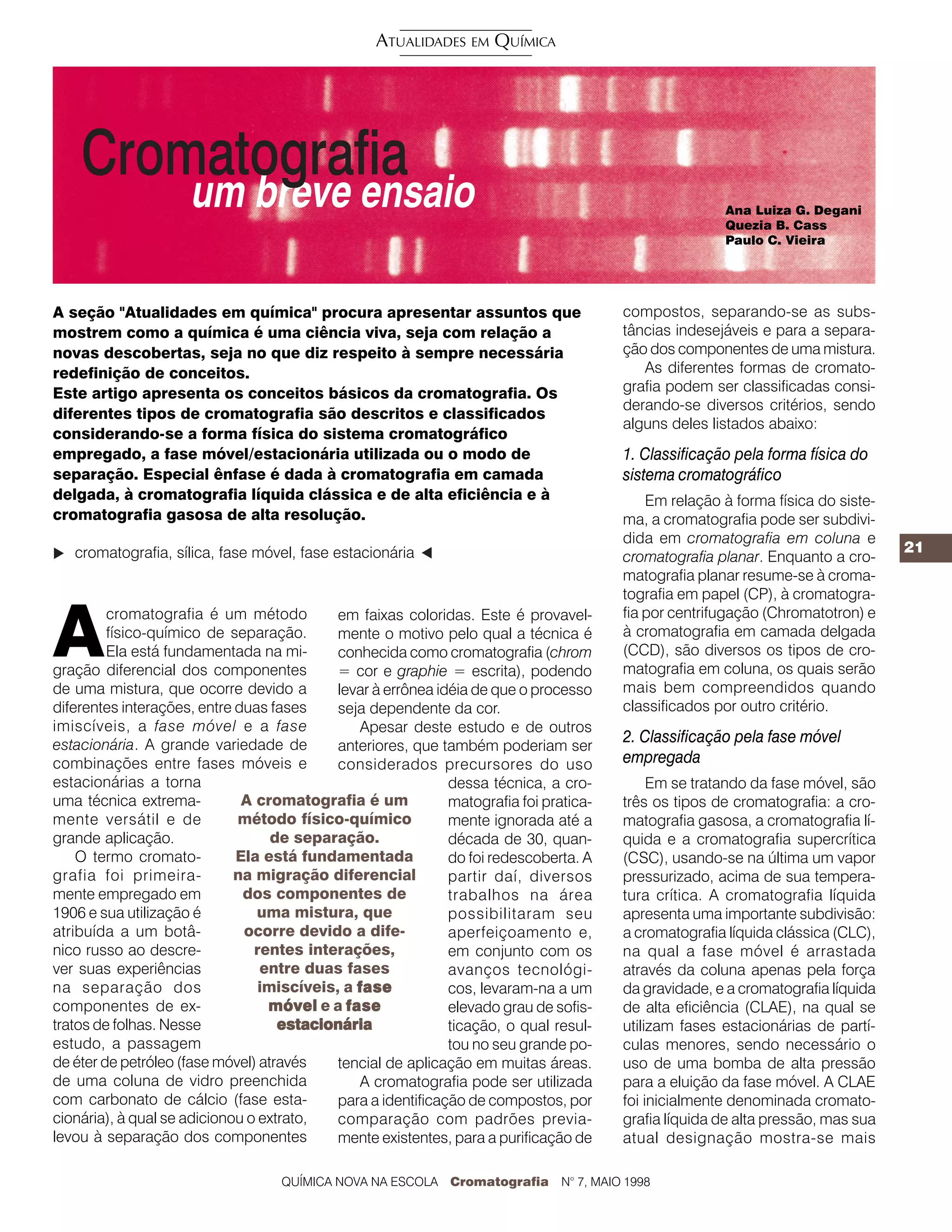 O documento descreve os conceitos básicos e classificações da cromatografia. A cromatografia é um método físico-químico de separação fundamentado na migração diferencial dos componentes de uma mistura entre duas fases imiscíveis. As principais classificações consideram a forma física do sistema, a fase móvel/estacionária utilizada e o modo de separação. Destacam-se a cromatografia em camada delgada, a cromatografia líquida clássica e de alta eficiência e a c