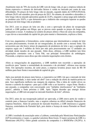 A receita da LBR vem principalmente do leite longa vida, porém os preços caíram no fim de 2013, afetando o fluxo de caixa. A empresa tem negociado pagamentos e usado recebíveis para manter as operações. Espera-se que os preços se estabilizem até abril, mas a LBR continua buscando vender ativos ou o controle para se tornar lucrativa novamente.