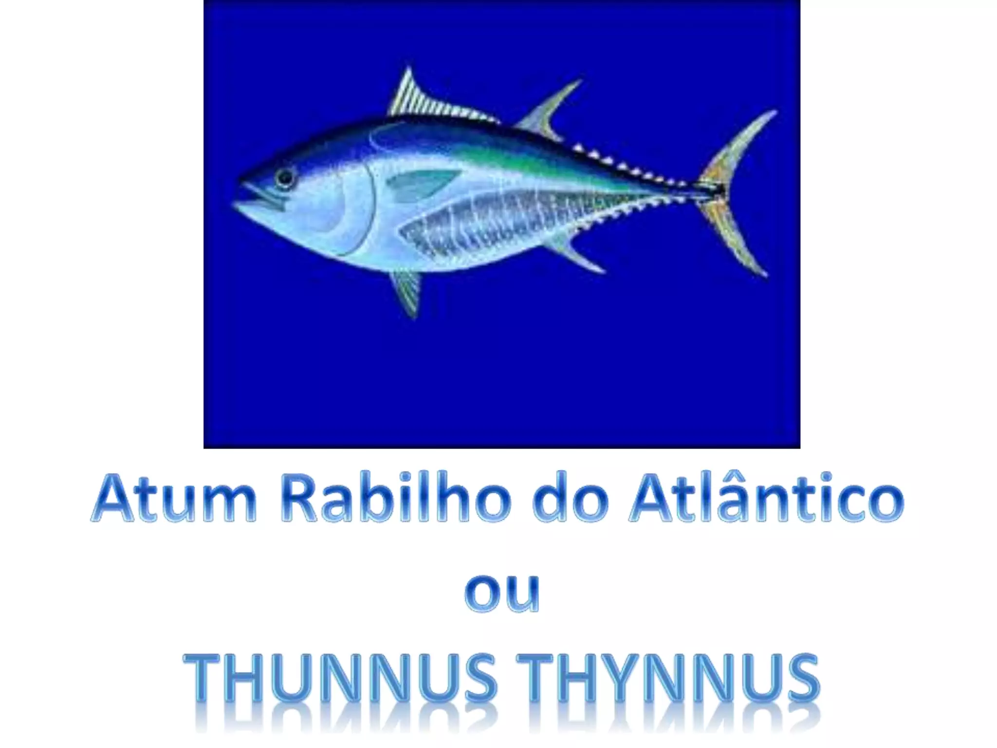 O documento descreve a espécie Thunnus thynnus, conhecida como atum-rabilho. É uma espécie de atum que pode chegar a 458 cm e 684 kg, e apresenta populações distintas no Atlântico Norte, Mediterrâneo e África do Sul. O atum-rabilho realiza migrações entre o Golfo do México e o Mar Cantábrico e é uma importante fonte de alimentação e comércio internacional.