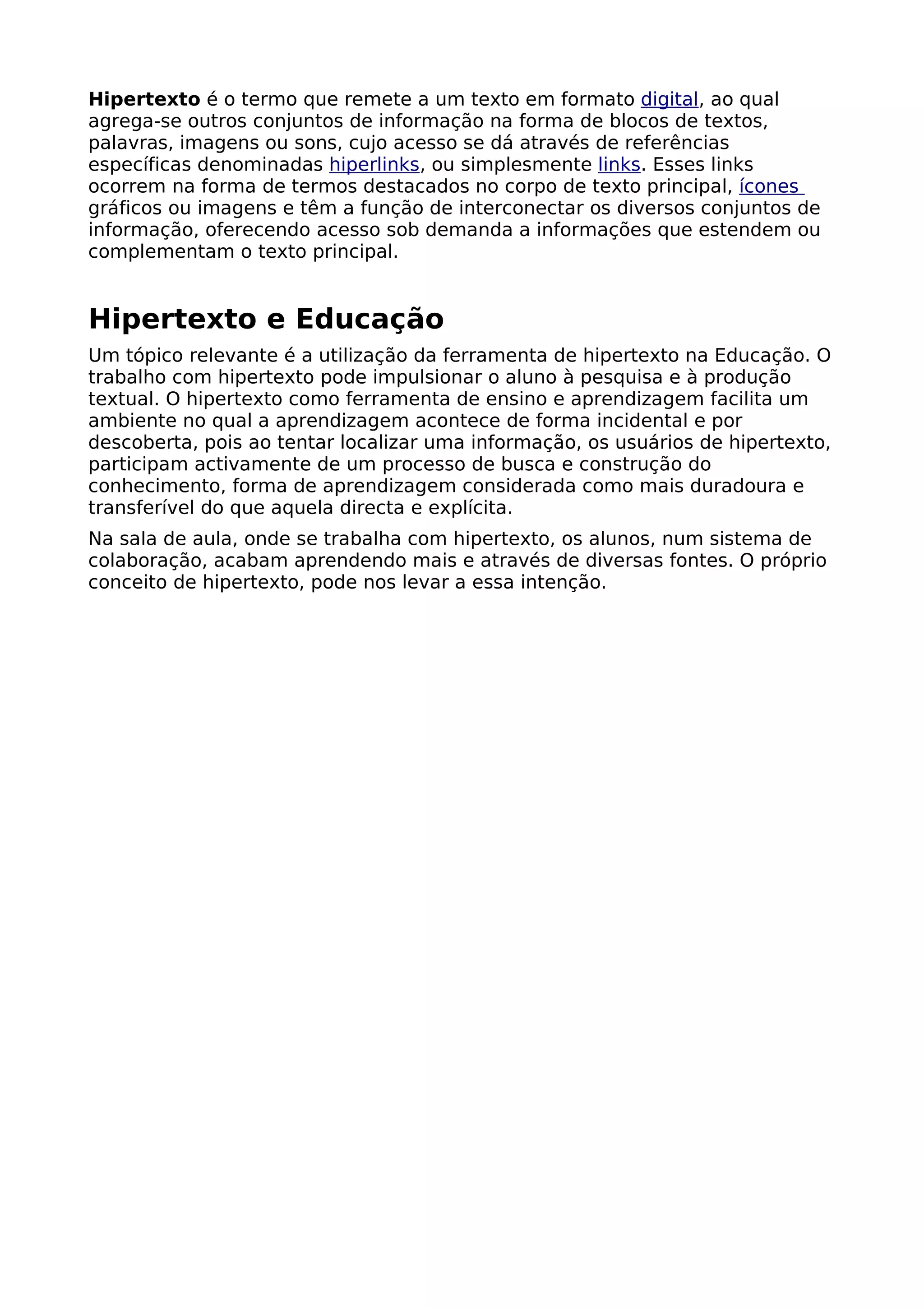 Hipertexto é um texto digital que contém blocos de informação interconectados por links, permitindo acesso sob demanda a informações relacionadas. O uso de hipertexto na educação pode impulsionar pesquisas e produção textual por alunos, facilitando uma aprendizagem incidental e por descoberta através da busca de informações. Na sala de aula, trabalhar com hipertexto em sistemas colaborativos pode levar os alunos a aprenderem mais através de múltiplas fontes.