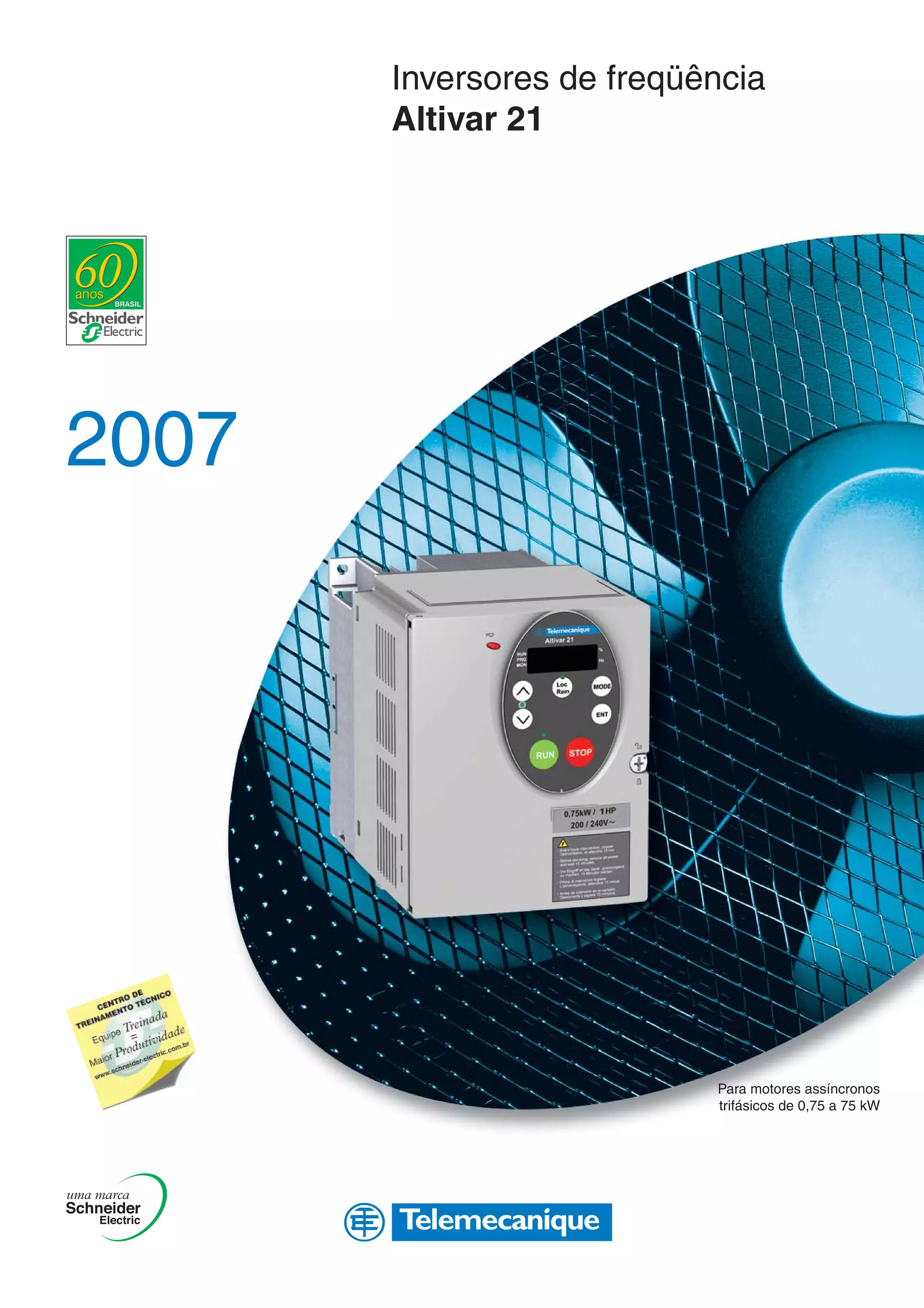 O documento descreve os inversores de frequência Altivar 21 da Schneider Electric, projetados para motores assíncronos trifásicos de 0,75 a 75 kW. Ele fornece informações sobre as características, funcionamento e opções dos inversores, incluindo controles de velocidade, funções, comunicações e especificações técnicas.