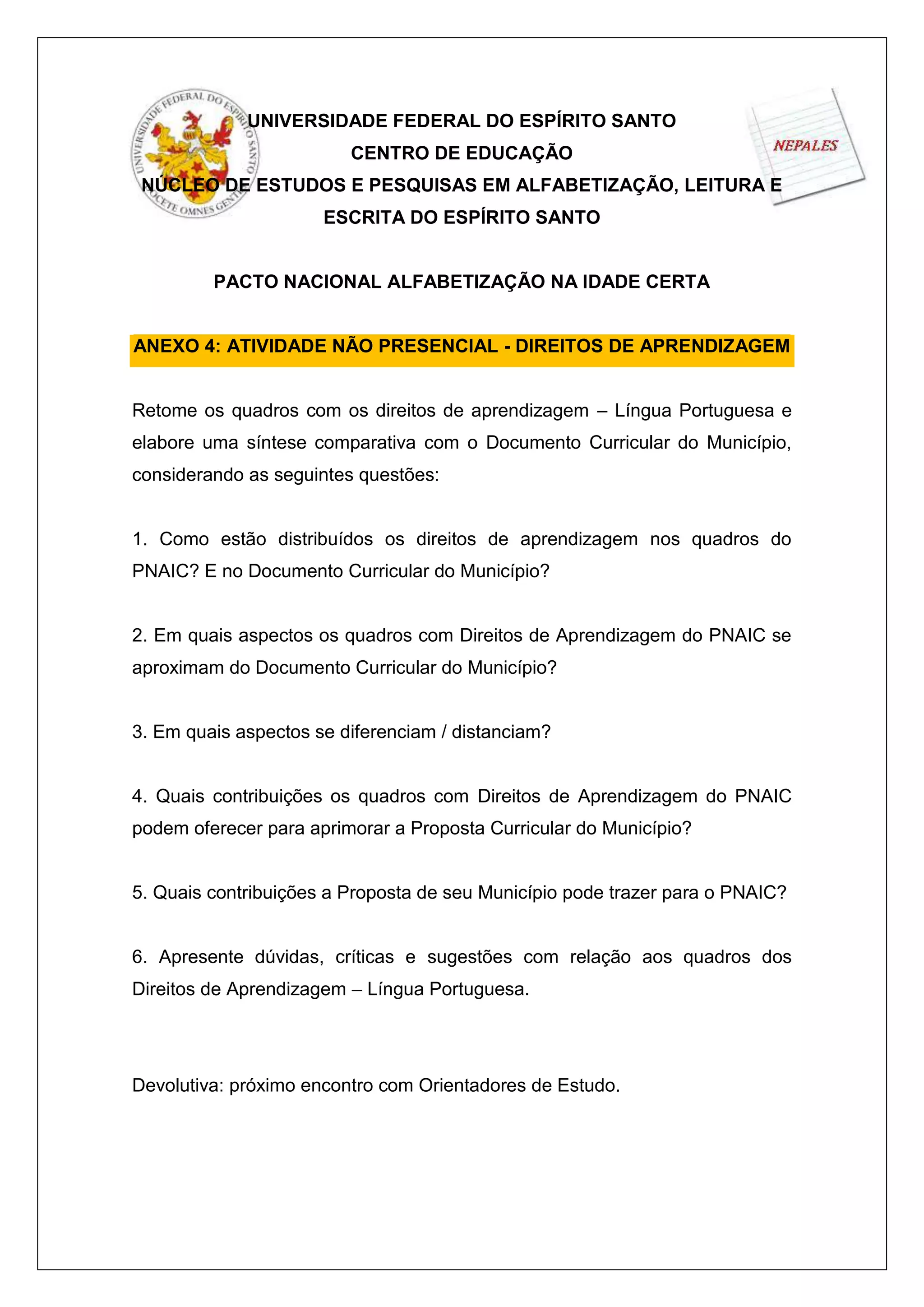 Este documento pede para analisar os quadros com direitos de aprendizagem do Pacto Nacional de Alfabetização na Idade Certa (PNAIC) em comparação com o Documento Curricular do município, considerando como estão distribuídos os direitos, em que aspectos se aproximam e diferem, e como podem se contribuir mutuamente para aprimorar a proposta curricular.