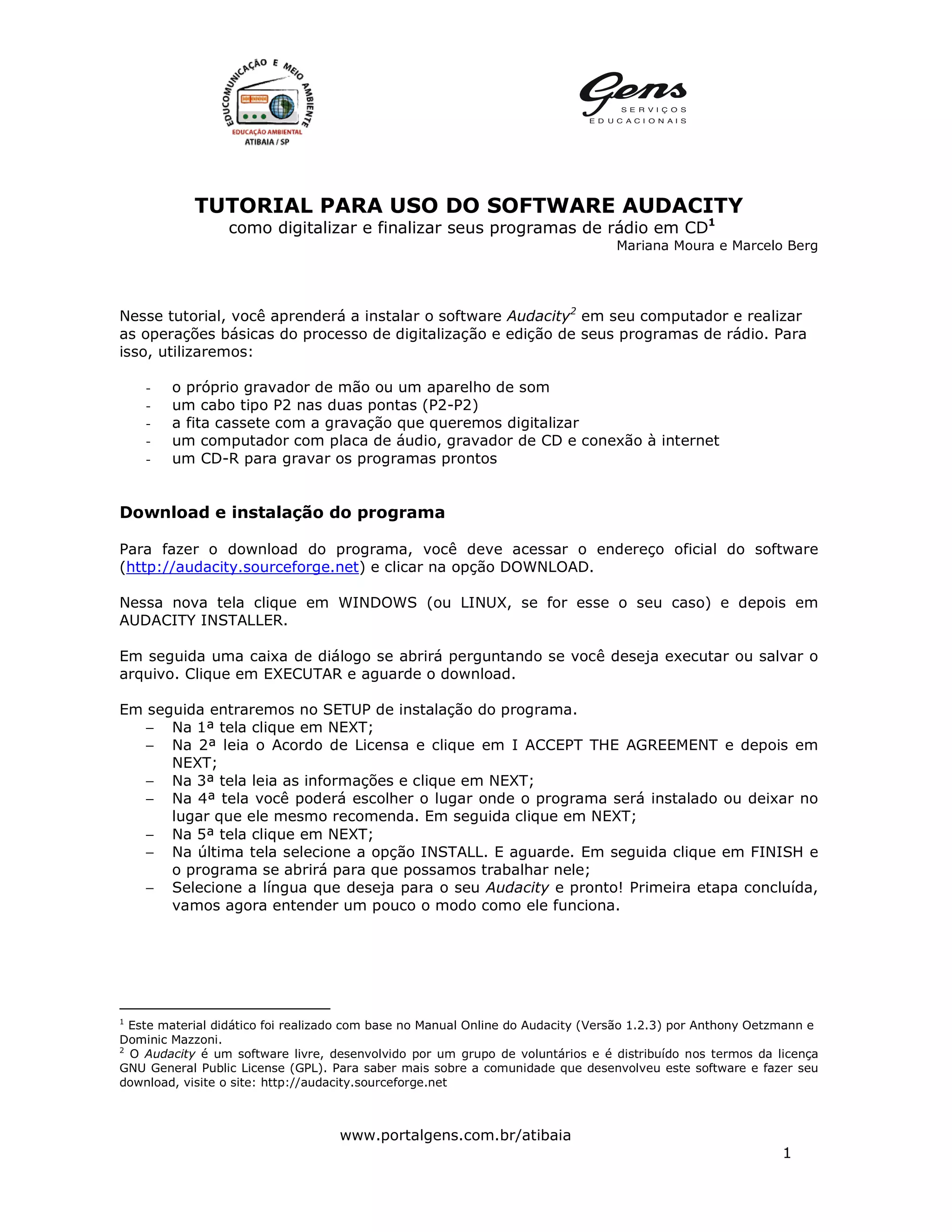 download, visite o site: http://audacity.sourceforge.net
