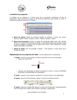 Este documento fornece instruções passo-a-passo para digitalizar programas de rádio gravados em fita cassete utilizando o software gratuito Audacity, realizando edições básicas e salvando o arquivo finalizado em formato WAV para gravação em CD.
