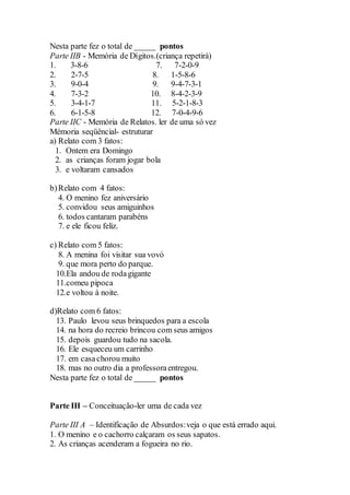 Este documento apresenta os resultados de um teste de audibilização aplicado a uma criança. O teste avaliou habilidades como discriminação fonêmica, memória de frases, dígitos e relatos, conceituação, identificação de absurdos e organização sintática. Ao final, o documento conclui o nível da criança e aspectos que precisam ser trabalhados, como operações mentais.