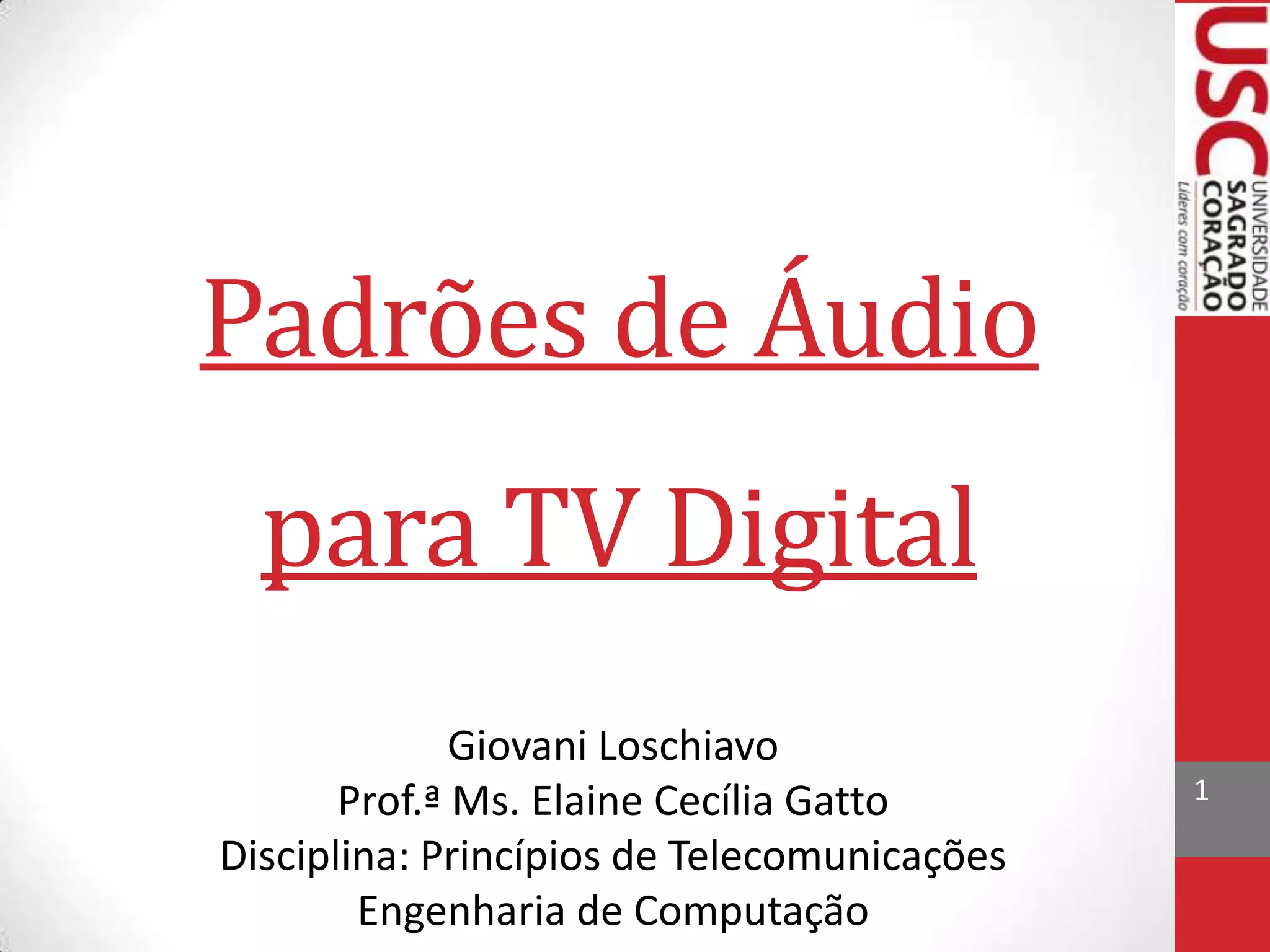 O documento discute os padrões de áudio digital para TV, descrevendo brevemente o PCM, compressão de áudio digital e modelos perceptuais. Também apresenta os principais padrões de áudio para TV digital como MPEG, AAC e Dolby, além de mencionar os padrões adotados nos EUA, Europa, Japão e Brasil.