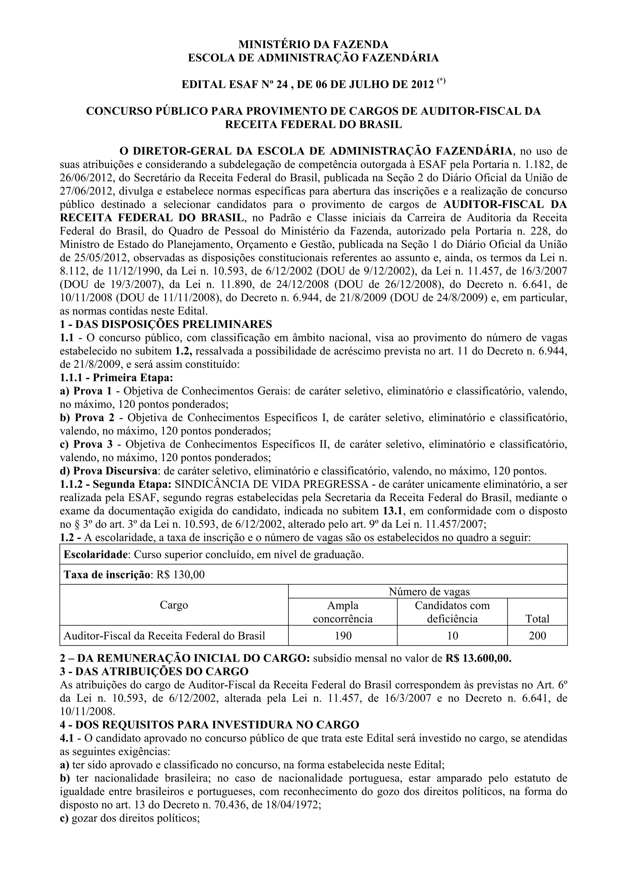 Este edital anuncia a abertura de um concurso público para o provimento de 200 vagas de Auditor-Fiscal da Receita Federal do Brasil, sendo 190 vagas de ampla concorrência e 10 vagas para candidatos com deficiência. O concurso será constituído de provas objetivas e discursivas na primeira etapa e sindicância de vida pregressa na segunda etapa. O edital estabelece normas como requisitos para investidura no cargo, taxa de inscrição no valor de R$130,00 e isenção para candidatos de baixa renda in