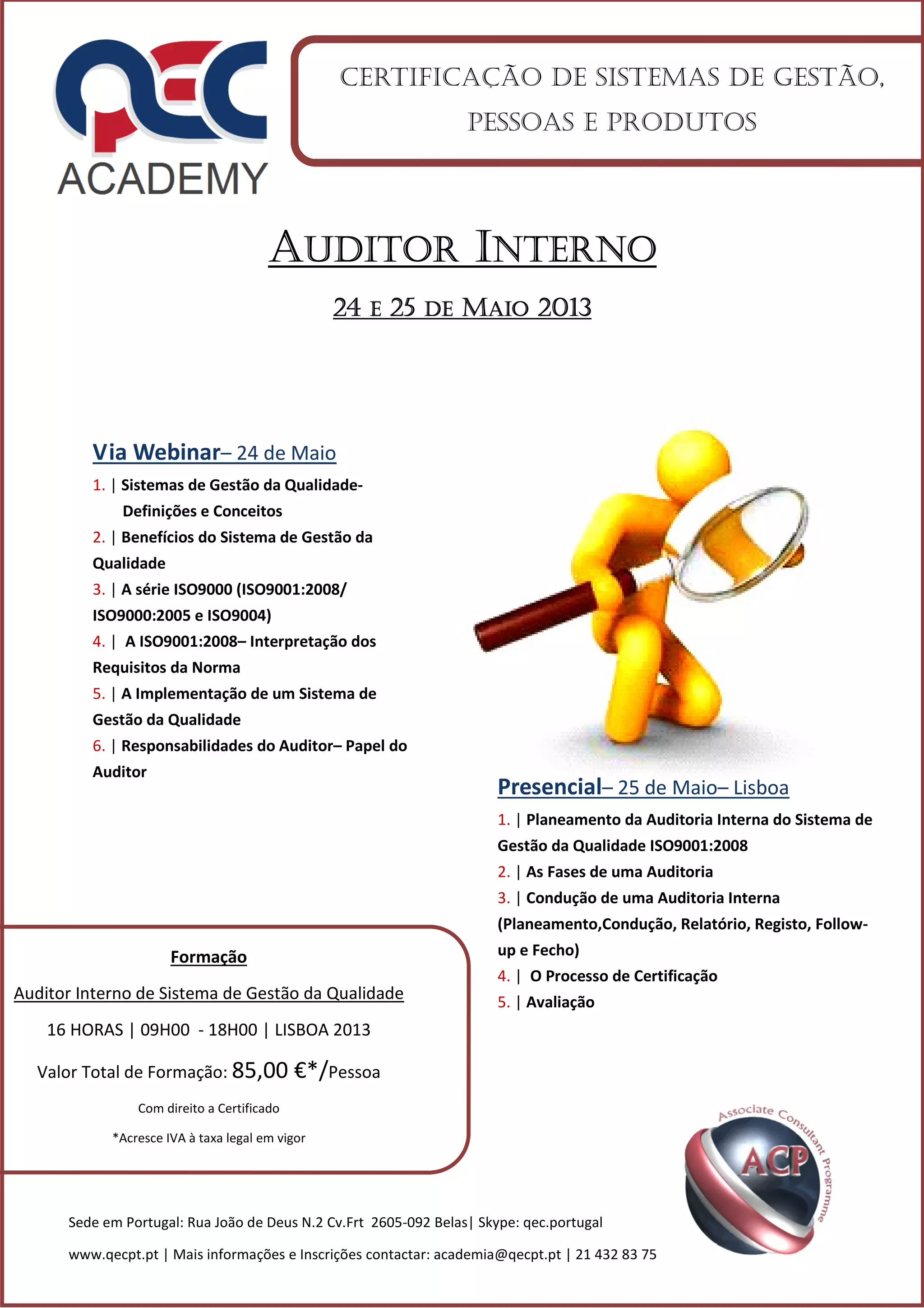 O documento descreve um curso de formação de 16 horas para Auditor Interno de Sistema de Gestão da Qualidade. O curso será realizado em Lisboa nos dias 24 e 25 de maio e abordará tópicos como os conceitos e benefícios de sistemas de gestão da qualidade, a norma ISO 9001, o papel do auditor, e como planejar e conduzir uma auditoria interna. O valor total do curso é de 85 euros por pessoa.