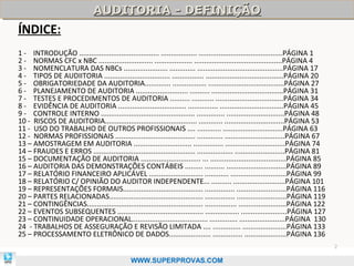 Este documento fornece uma introdução sobre auditoria, definindo o termo e descrevendo os principais tipos de auditoria. Também resume as principais normas do Conselho Federal de Contabilidade que regulamentam a prática de auditoria no Brasil e sua convergência com as normas internacionais.