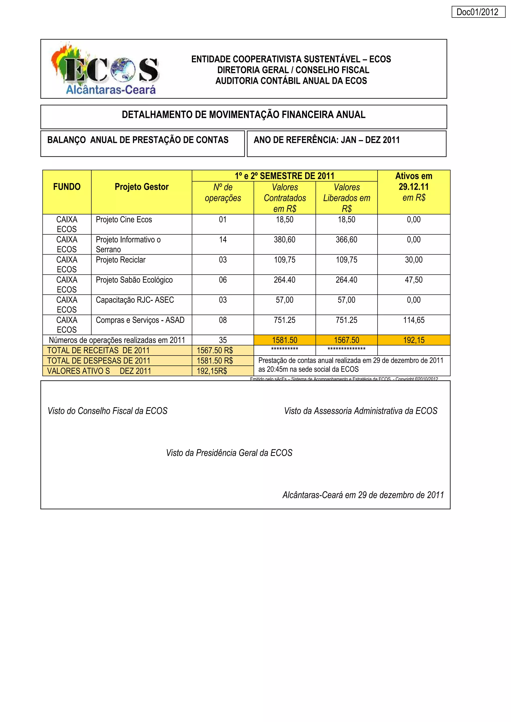 O documento fornece um relatório financeiro anual da entidade cooperativista sustentável ECOS para o ano de 2011. Ele detalha os projetos gestores, número de operações, valores contratados e liberados para cada fundo da ECOS, com um total de receitas e despesas para o ano. Ele também mostra os ativos remanescentes em 29 de dezembro de 2011.
