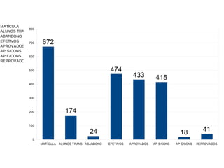 O documento descreve uma escola localizada na Avenida Londrina número 12 na cidade de Loanda. A escola tem 11 salas de aula e oferece ensino fundamental de 5a a 8a série e ensino médio de 1o a 3o ano, com aulas pela manhã, tarde e noite. A escola atende 800 alunos e foi a primeira da cidade de Loanda.