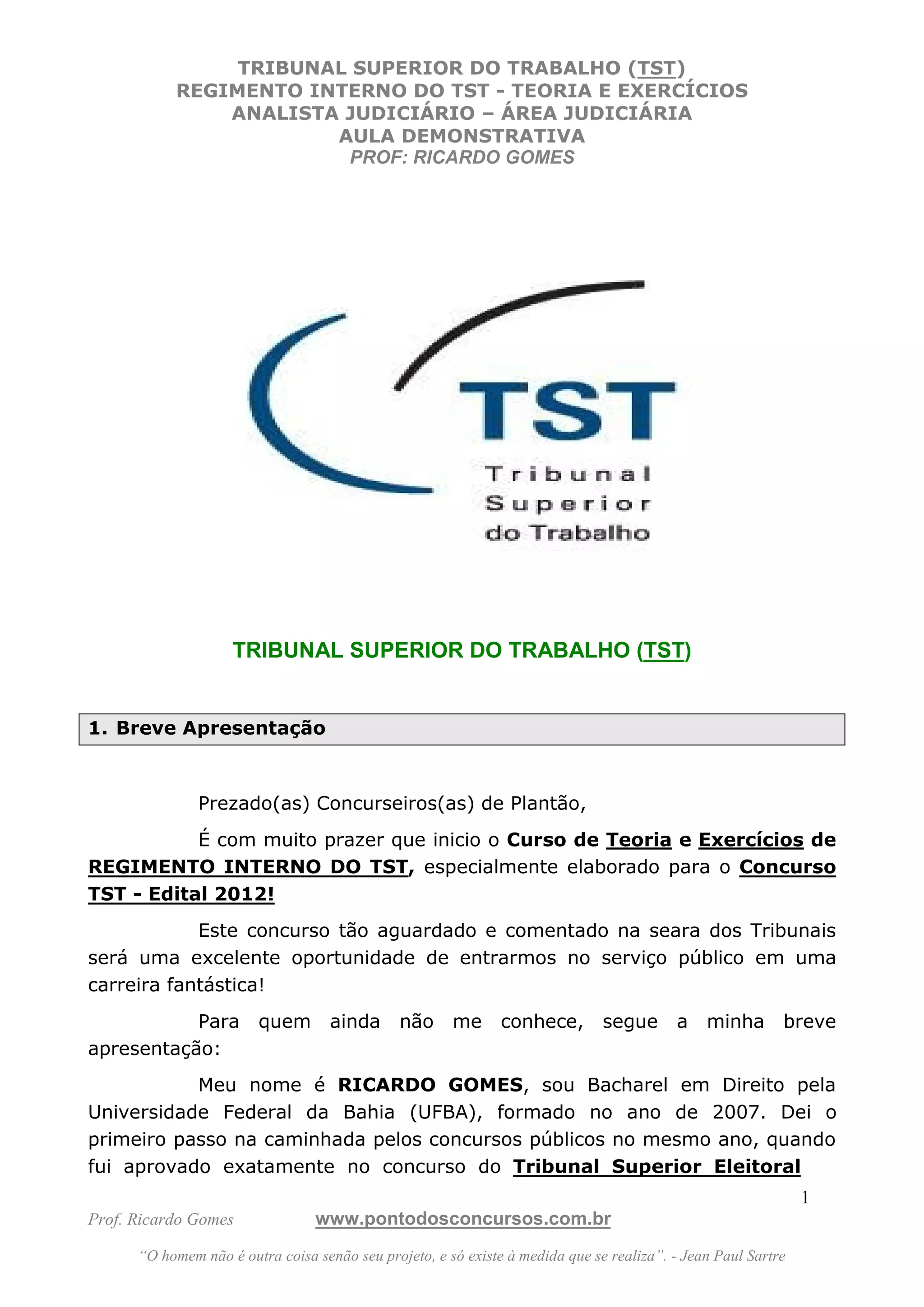 Este documento apresenta um curso sobre o Regimento Interno do Tribunal Superior do Trabalho (TST) ministrado pelo professor Ricardo Gomes. O curso abordará o Regimento Interno do TST em 6 aulas, incluindo uma aula demonstrativa. A aula demonstrativa inicia com uma breve apresentação do TST e uma discussão sobre sua composição e jurisdição nacional.