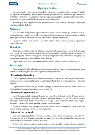 O documento apresenta informações sobre tipologias e gêneros textuais. Resume: (1) Apresenta as tipologias narrativa, descritiva e dissertativa; (2) Detalha alguns gêneros textuais como carta, propaganda, charge e poema; (3) Fornece exemplos de gêneros literários como conto, fábula e crônica.