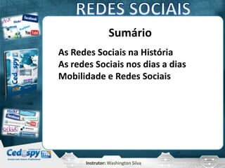 O documento discute a evolução histórica das redes sociais, desde as primeiras formas de interação social entre pessoas até as redes sociais digitais modernas. Ele descreve algumas das primeiras redes sociais digitais como AOL Messenger, SixDegrees e Friendster e como o MySpace, LinkedIn, Orkut e Facebook popularizaram o conceito e cresceram em popularidade.