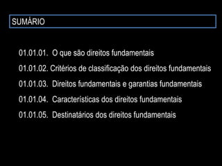 01. O documento discute os direitos fundamentais, classificando-os em individuais e coletivos. Apresenta critérios de classificação como os valores protegidos, positivação constitucional e gerações. 02. Direitos individuais protegem a liberdade do indivíduo frente ao Estado, enquanto direitos coletivos protegem interesses de grupos. 03. Direitos são classificados também em gerações: 1a geração protege liberdades públicas; 2a geração protege direitos sociais e econômicos; 3a geração prote