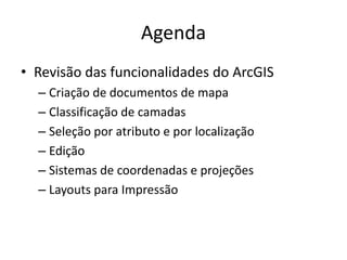 O documento descreve a agenda de uma aula sobre sistemas de informações geográficas aplicados a bacias hidrográficas. A agenda inclui revisar funcionalidades do ArcGIS como criação de mapas, classificação de camadas e edição, além de funcionalidades do ArcGIS Spatial Analyst e ArcHydro para análise de dados raster e vetoriais relacionados a bacias hidrográficas.