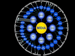 1) O documento apresenta a programação de uma disciplina sobre mídia, com datas e temas das aulas, critérios de avaliação e tabela de preços de espaços publicitários em uma revista.